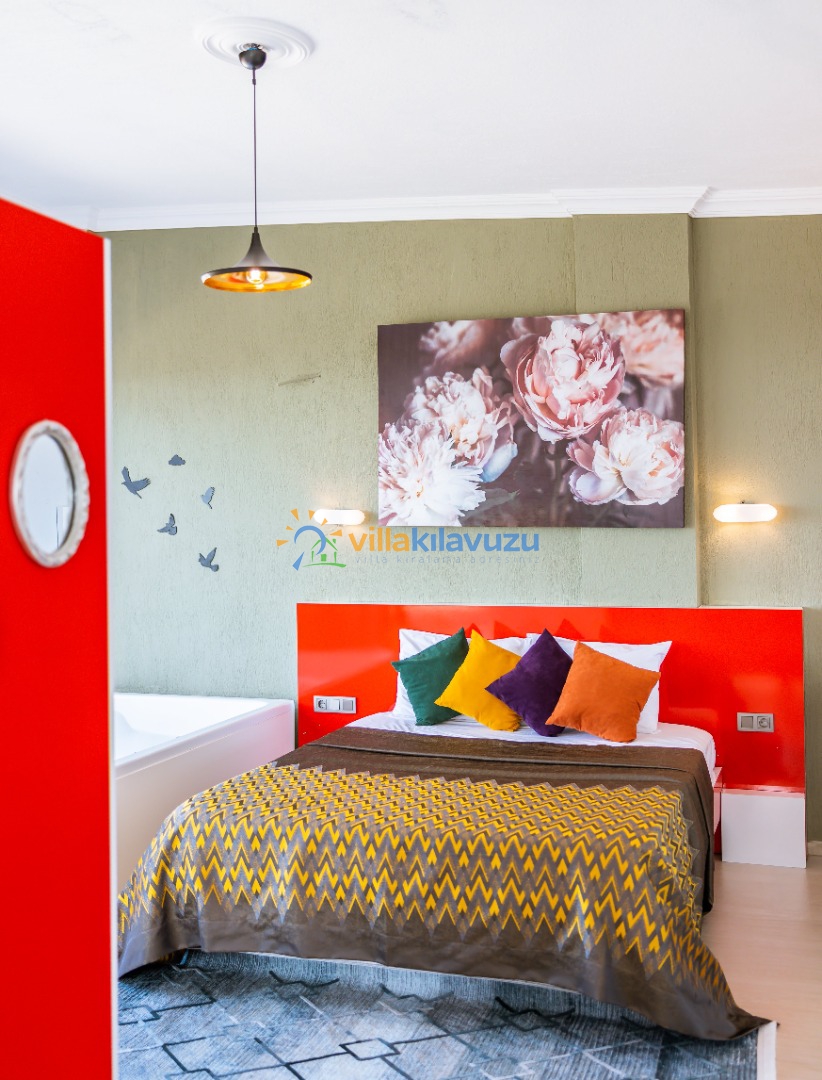 -Villamız 1 yatak odasına sahip olup 2 kişilik konaklama kapasitesine sahiptir.